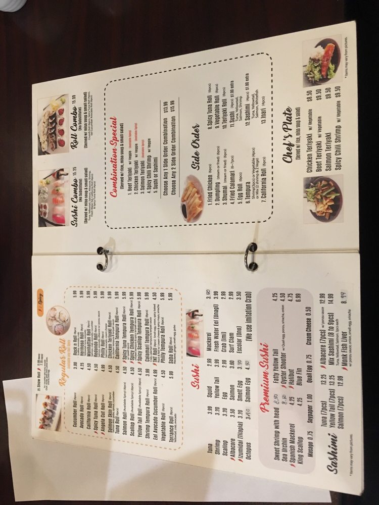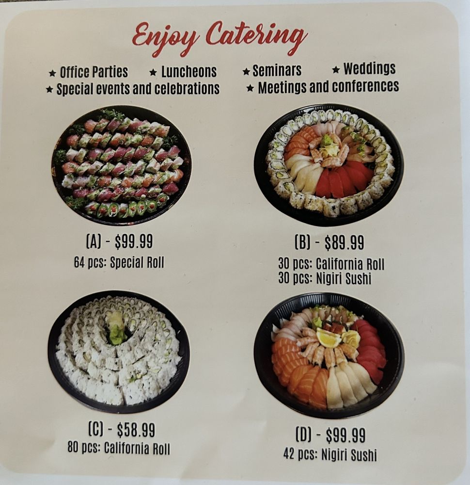 Served with miso soup and small salad tuna, yellowtail, salmon, albacore, shrimp, fresh water eel, California roll 4 pieces and spicy tuna roll 4 pieces.